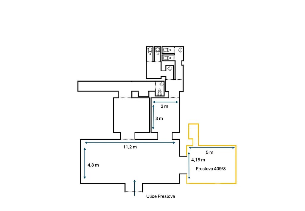 Prostor bude k pronajmutí od ledna 2026. Skládá se ze dvou místností pro provozovnu - velké se zřízeným barem a druhé menší, dále kuchyně, toalet pro hosty, zázemím pro personál s vlastním sociálním zařízením a skladovací místnosti.