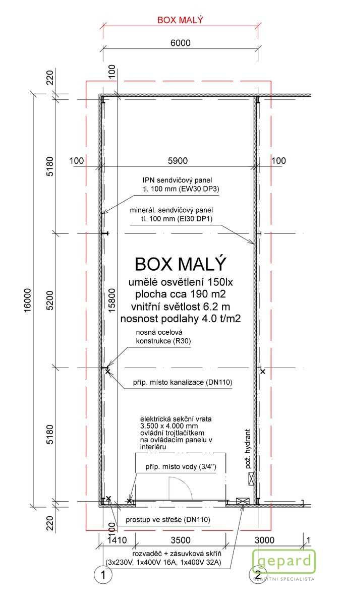 • Vnitřní půdorysné rozměry (k vnitřnímu líci opláštění): 15.8 x 5.9 m (+/- 0.25 m)