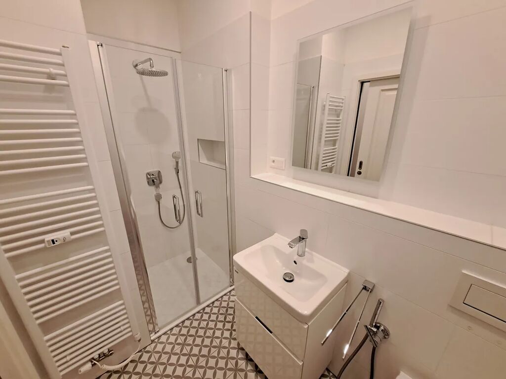 Koupelna s WC je vybavena sprchovým koutem, umyvadlem, zrcadlovou skříňkou, topným žebříkem, WC.