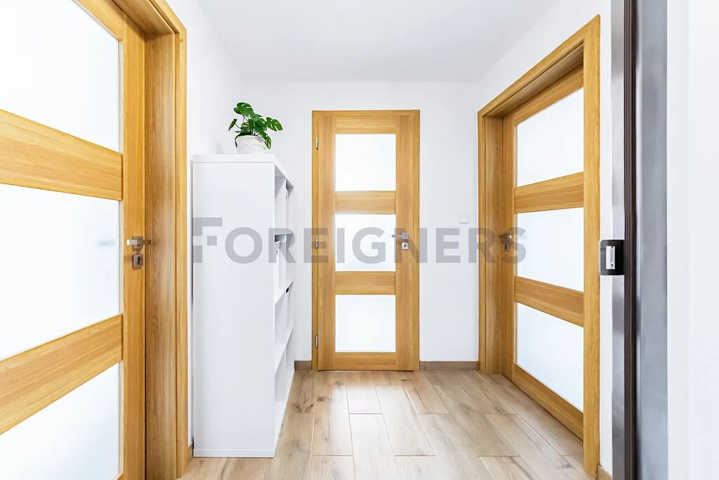 Při vstupu do domu vás přivítá prostorná chodba s vestavěnou šatní skříní, která poskytuje dostatek úložného prostoru. Přízemí nabízí útulnou pracovnu s prosvětleným francouzským oknem a přístupem na jednu z teras. Dále je zde koupelna a technická místnost.