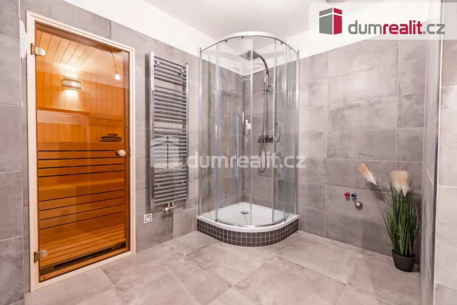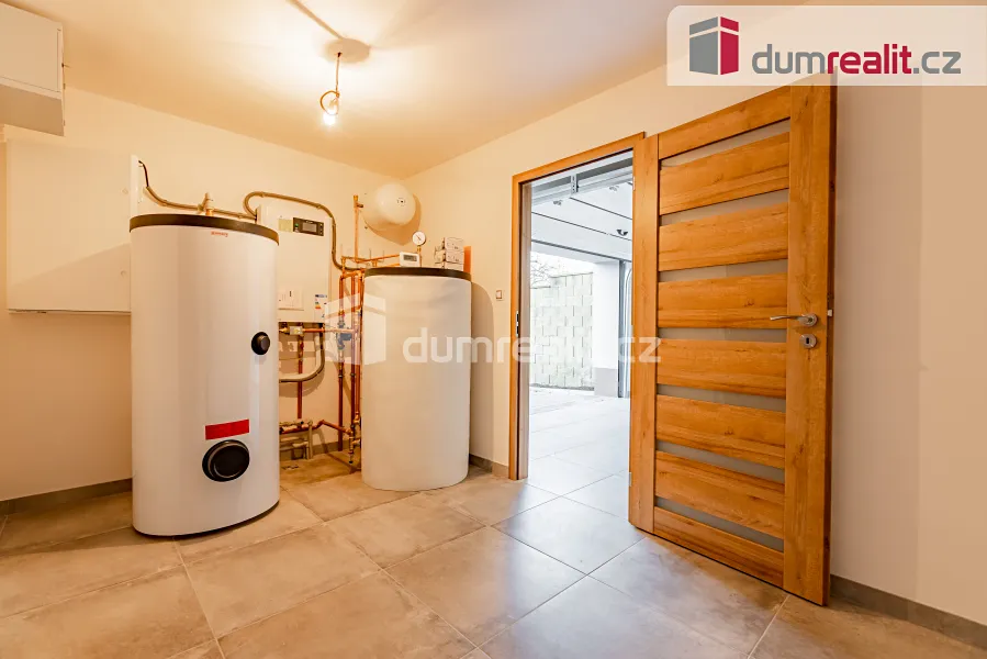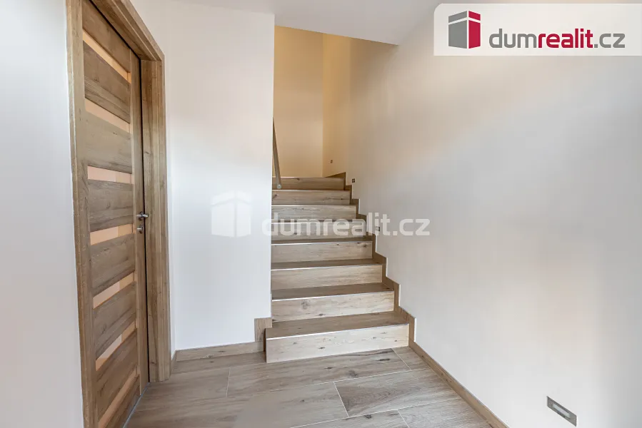 Přízemí se skládá ze vstupní chodby, z které je přístup do garáže, technické místnosti s šatnou na zimní věci a boty, dále z garáže do místnosti pro posilovnu, sauny s wc a sprchovým koutem. Je zde i úložný prostor pod schody, které vedou do 1. patra do vzdušného a velmi prosvětleného obývacího pokoje, s jídelní částí a kuchyňským koutem, wc, koupelnou se sprchovým koutem, ložnicí a malou šatnou.