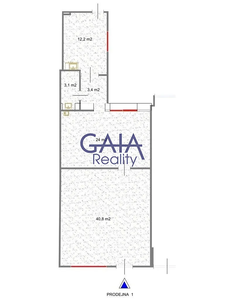 Hlavní prostor o výměře 65 m² je nyní rozdělen sádrokartonovou příčkou na dvě samostatné místnosti, úprava je však snadno vratná a lze jej využít i jako jeden celek. Součástí prostor je dále kuchyňka a samostatné WC. Uspořádání prostor je zřejmé z vyobrazeného nákresu ve fotogalerii.