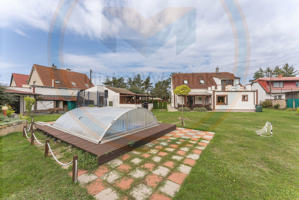 Prostorný samostatně stojící rodinný dům 5+kk, dvě koupelny, bazén, 2x garáž + další místo na parkování na příjezdové cestě a zahrada s posezením – ideální místo pro váš nový domov jen 40 minut od Prahy.
