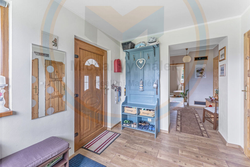 Dále se zde nachází obývací pokoj s krbovou vložkou, další pokoj využívaný jako pracovna a technická místnost, samostatné WC a koupelna s vanou.