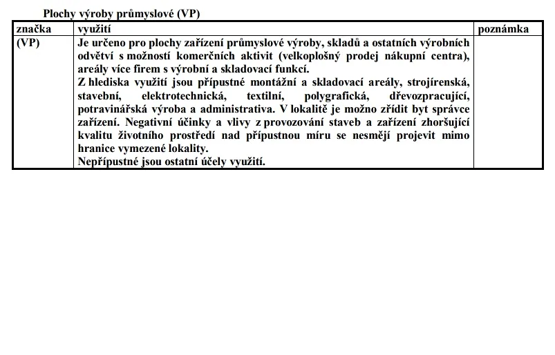 Území je určeno pro plochy zařízení průmyslové výroby, skladů a ostatních výrobních odvětví s možností komerčních aktivit (velkoplošný prodej nákupní centra), areály více firem s výrobní a skladovací funkcí. Z hlediska využití jsou přípustné montážní a skladovací areály, strojírenská, stavební, elektrotechnická, textilní, polygrafická, dřevozpracující, potravinářská výroba a administrativa. Je možné zde vybudovat byt pro správce.