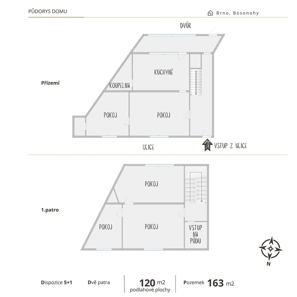 Nabízíme ke koupi dvoupodlažní rodinný dům s dispozicí 5+1 v městské části Brno–Bosonohy, přímo u hlavní silnice. Dům stojí na pozemku o velikosti 163 m², nabízí cca 120 m² podlahové plochy a je v původním, ale plně obyvatelném stavu.