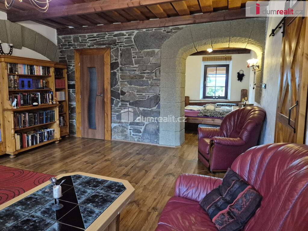 Částečně podsklepený dvoupodlažní dům nabízí v prvním patře prostorný, designově osobitý byt 4+1, kdy tři ze čtyř pokojů jsou neprůchozí a ložnice je napojena otevřeným průchodem na obývák s dekorací z kamene. V koupelně je vana, umyvadlo WC a prostor na pračku. Z centrální chodby je průchod prosklenou stěnou na verandu, ze které je skvělý přehled o dění na zahradě. Dále v podkroví započatou vestavbu, potom zahradu, stodolu a garáž.