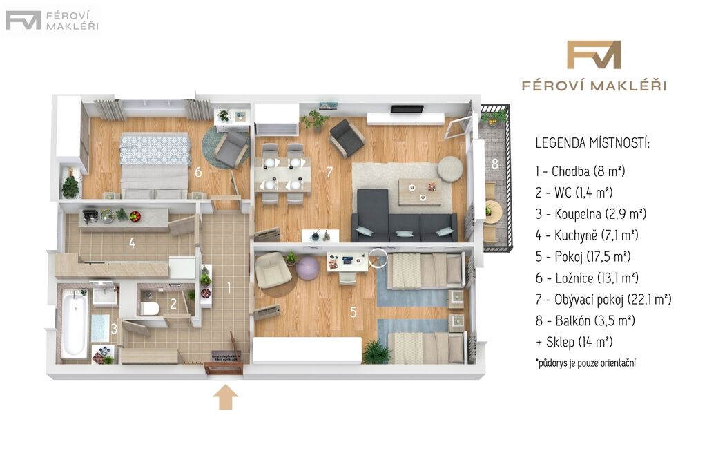 Kromě samotného bytu oceníte i balkon a velkorysý sklep o velikosti 14 m² – ideální prostor pro dílnu, kola nebo zásoby.