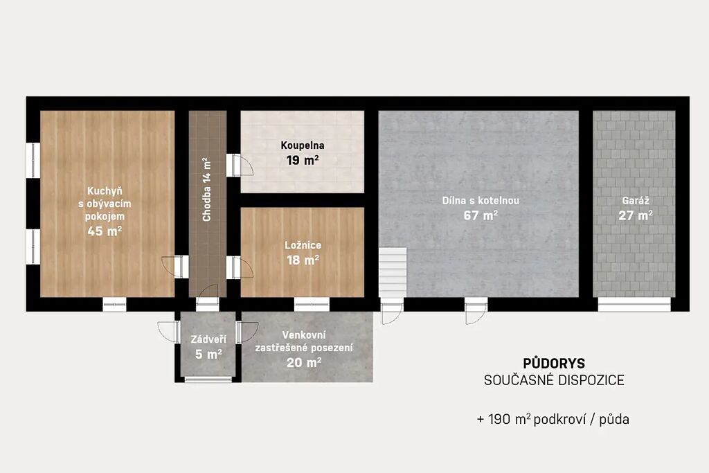 V našem osobním vlastnictví nabízíme k prodeji rodinný dům se zahradou v centru obce Krchleby okresu Kutná Hora. Dispozice domu je v současném stavu 2+kk + koupelna (100 m2), dílnou 67 m2 a garáží 27 m2, která lze přetvořit např. na 5+kk viz. návrh půdorysu v inzerci. Pro rozšíření bydlení je také možné využít podkroví o užitné ploše 190 m2. Dům leží na pozemku o celkové výměře 752 m2 z čehož je 276.6 m² zastavěné plochy.
