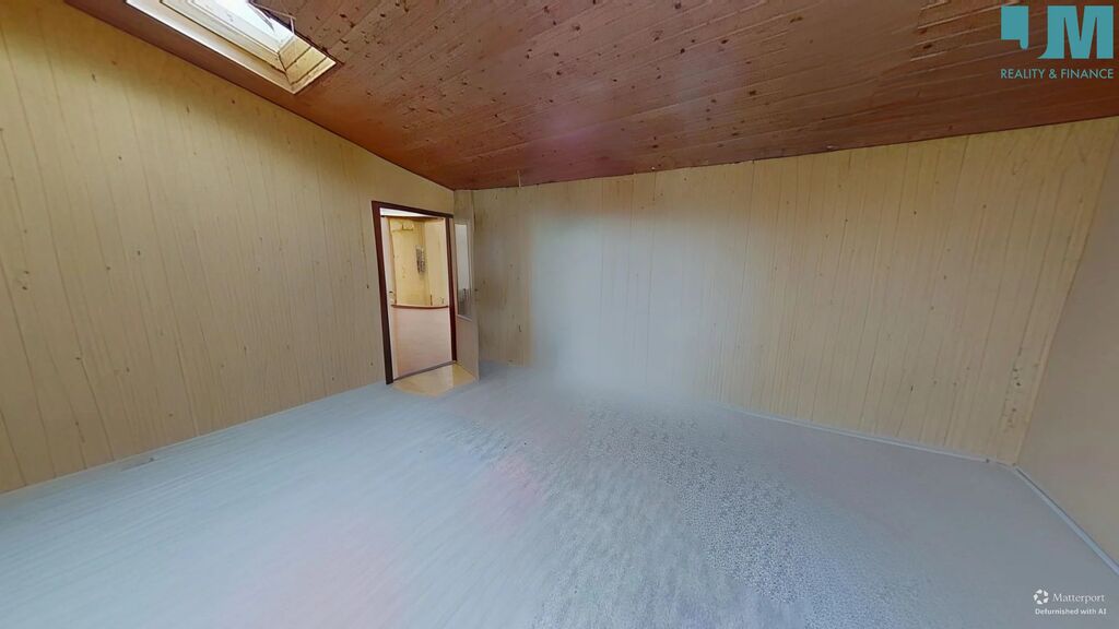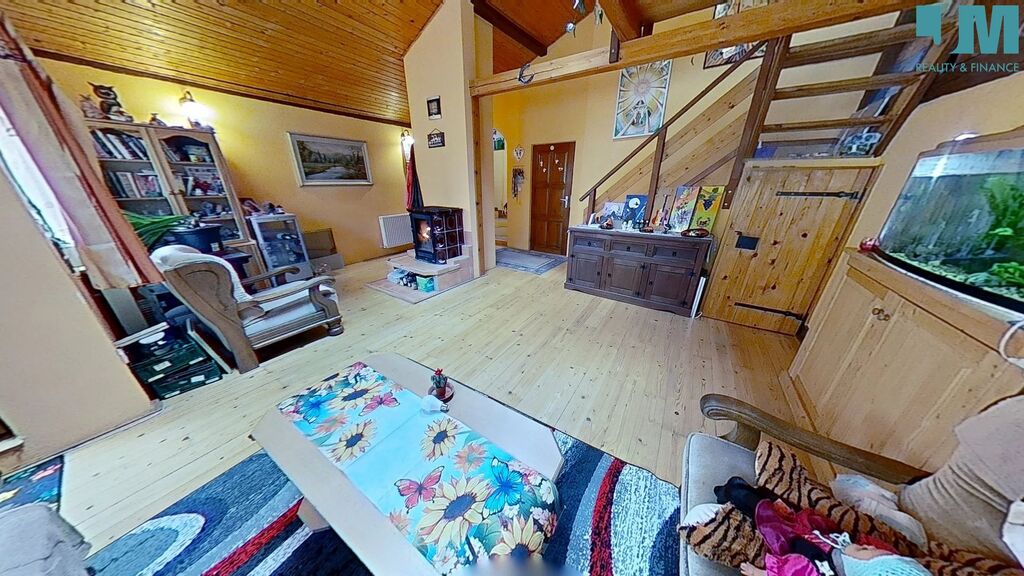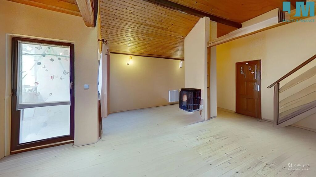 Dominantou bytu je prostorný obývací pokoj s krbem na dřevo, kde se snoubí hřejivé teplo ohně s útulností dřevěných podbitých stropů. Odtud vedou i dveře na balkon s výhledem do klidného vnitrobloku, ideálního pro ranní kávu či večerní posezení. V obýváku se také nacházejí dřevěné schody, které vás zavedou do originálně vytvořeného hracího prostoru – místa, které ocení zejména rodiny s dětmi.