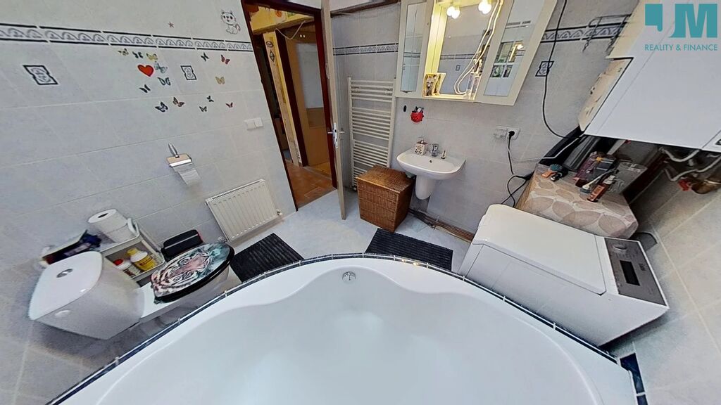 Kuchyně potěší svou velikostí i vybavením – najdete zde kuchyňskou linku, kombi sporák, digestoř a myčku. Koupelna je vybavena vanou, umyvadlem, zrcadlovou galerií, toaletou a plynovým kotlem, který zajišťuje vytápění i ohřev vody. Před bytem se nachází také praktický úložný prostor navíc.