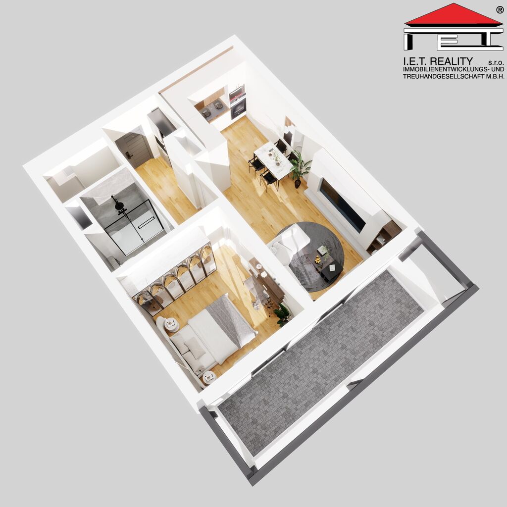 Interiér bytu je navržen v nadčasovém stylu s příjemnými přírodními tóny. Podlahy obytných místností pokrývá vinyl v dekoru dubového dřeva, koupelna a WC jsou obloženy keramickou dlažbou v decentních odstínech šedé s designem betonu. Koupelna je vybavena sprchovým koutem s bezpečnostním sklem, závěsným WC systémem Geberit a moderní černou sanitou značky Nobless. Vstupní dveře jsou bezpečnostní, protipožární, v antracitovém provedení, vnitřní dveře bílé s lakovaným povrchem. Byt má připravené vývody pro kuchyňskou linku (elektřina, voda, kanalizace), centrální vytápění s vlastním měřením a přípravu pro internet a domácí telefon. Zveřejněné fotografie jsou pouze ilustrativní pro představu klienta, jak by se dal byt vybavit.