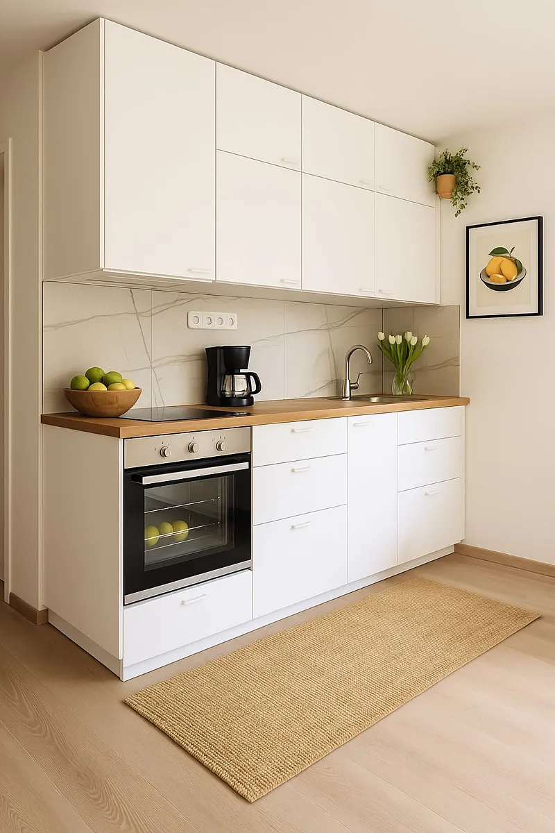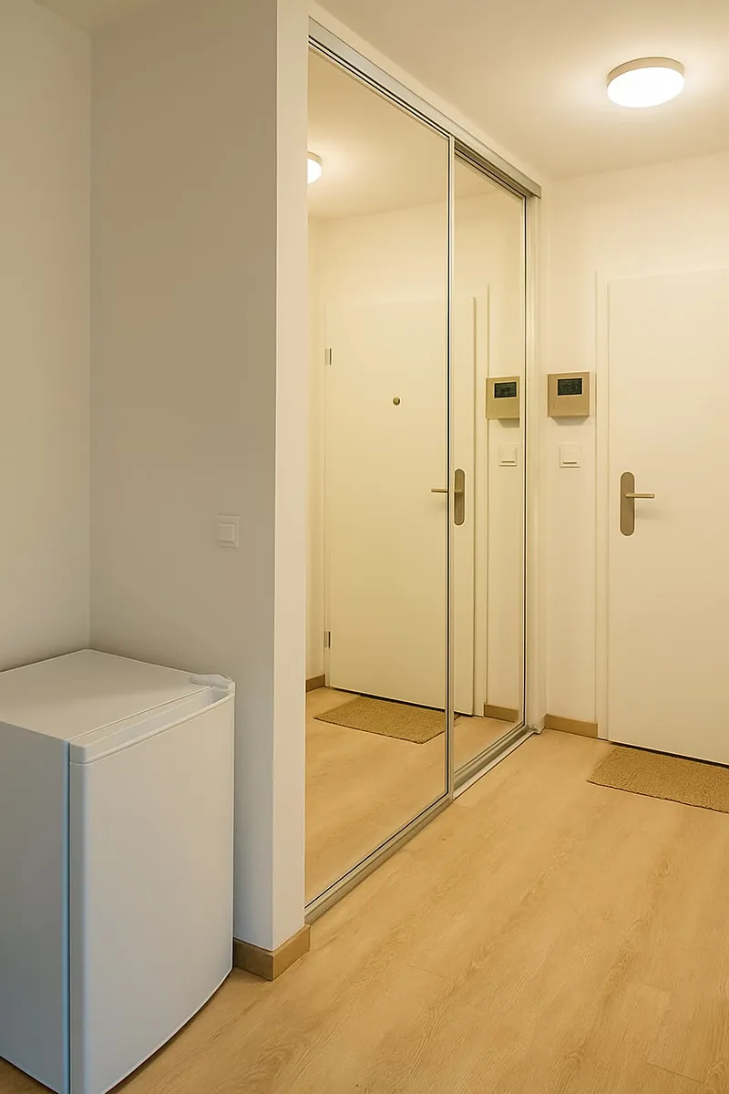 Dispozice: Byt je zařízený: moderní kuchyňská linka s troubou a varnou deskou a dostatkem úložného prostoru. Součastí vybavení je pohodlná postel, jídelní stůl se židlemi a šatní skříň v chodbě. V koupelně je k dispozici pračka.