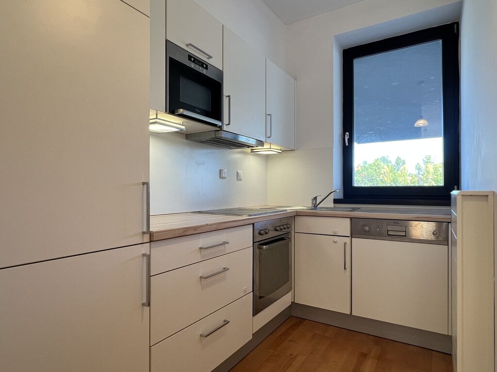 Dispozice bytu nabízí světlý obývací pokoj s plně vybaveným kuchyňským koutem, kde nechybí lednice s mrazákem, trouba, myčka nádobí a indukční varná deska.