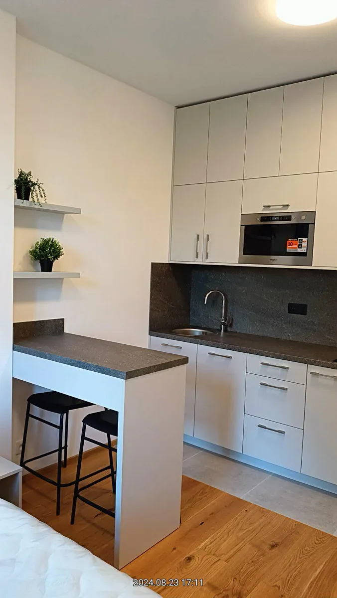 V bytě je kuchyňská linka se spotřebiči, koupelna se sprchovým koutem a toaletou. Výhled do vnitrobloku. V domě je k dispozici společná prádelna.