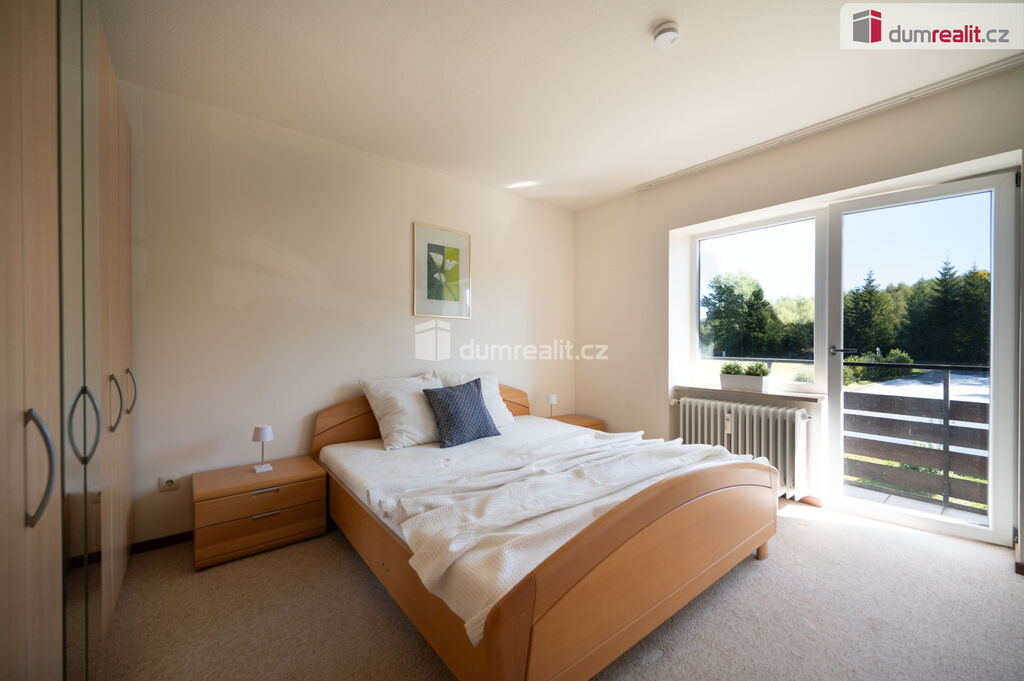 Dumrealit.cz Vám zprostředkuje exkluzivní prodej světlého bytu 2+1 se 2 lodžiemi, v osobním vlastnictví, v apartmánovém bytovém domě s výtahem, který se nachází jen pár kilometrů od českoněmeckých hranic v obci Haidmühle, na adrese Adalbert Stifter Strasse 95. Dispozice bytové jednotky, která se nachází ve 3. patře (4.NP), naleznete na orientačním plánku mezi fotografiemi. K apartmánu náleží dvě lodžie: 1) z ložnice na východní světová stranu; 2) z obývacího pokoj s krásným výhledem na západní světovou stranu. Byt se prodává s vybavením (viz. fotografie). Bytový dům prochází revitalizací, nově namontována plastová okna, rekonstrukce fasády se zateplením, solární systém, apod.. V apartmánovém domě je k využití společná herna s dětským koutkem a společná lyžárna (kolárna). Parkování je zdarma přímo před objektem.