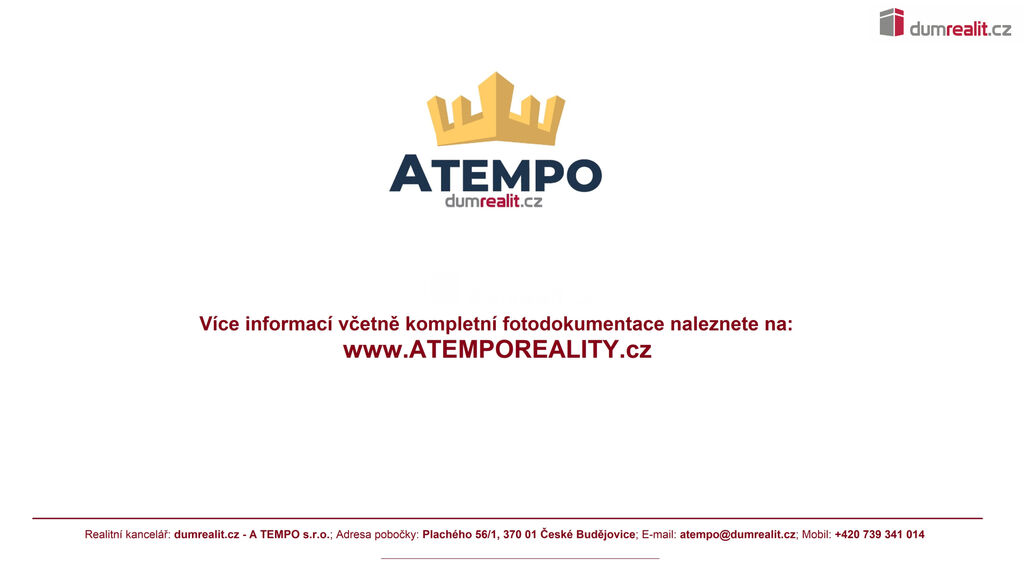 Více informací Vám poskytne realitní makléřka Bc. Martina Malkusová z realitní kanceláře A TEMPO fungující pod ochrannou známkou dumrealit.cz. Ev. číslo: 652669.
