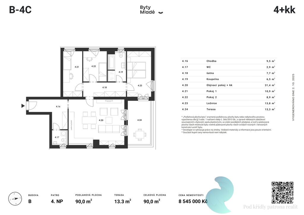 Nabízený byt č. B-4C o dispozici 4+kk, výměře 90 m2 a lodžií 13,3 m2, se nachází ve třetím patře budovy B. Disponuje vstupní chodbou, koupelnou, obývacím pokojem s kuchyňským koutem, neprůchozím pokojem, samostatnou toaletou a ložnicí.