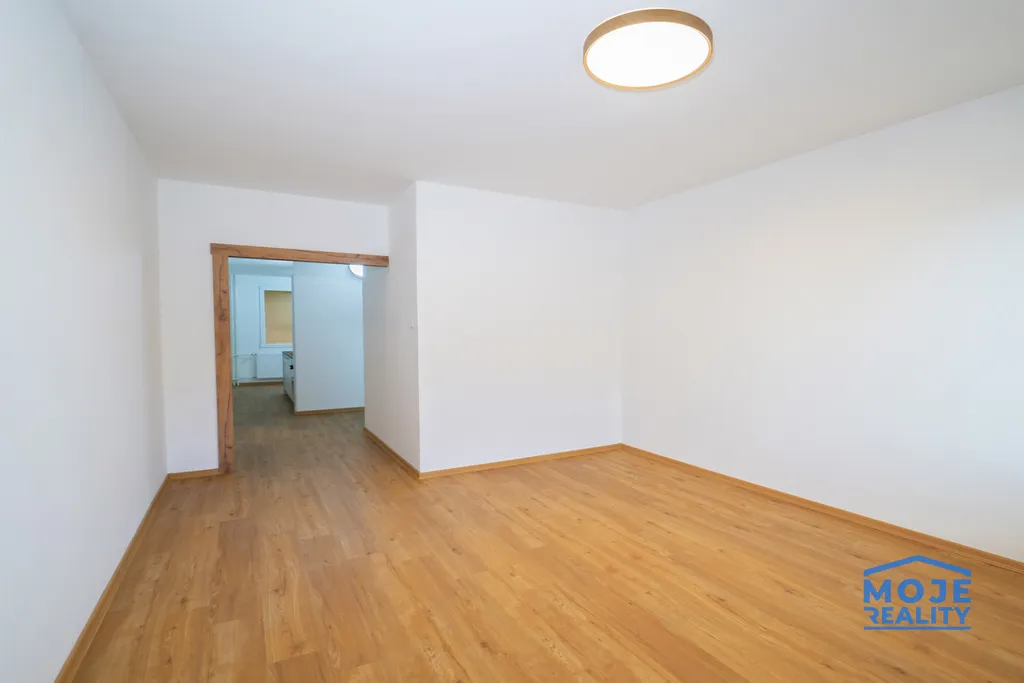 nové rozvody elektřiny, vody i odpadů, vyrovnané podlahy s celoplošnou dřevěnou krytinou, nové štuky a elektroinstalace