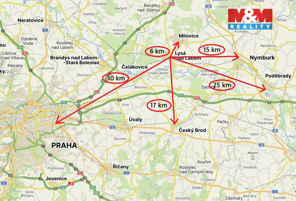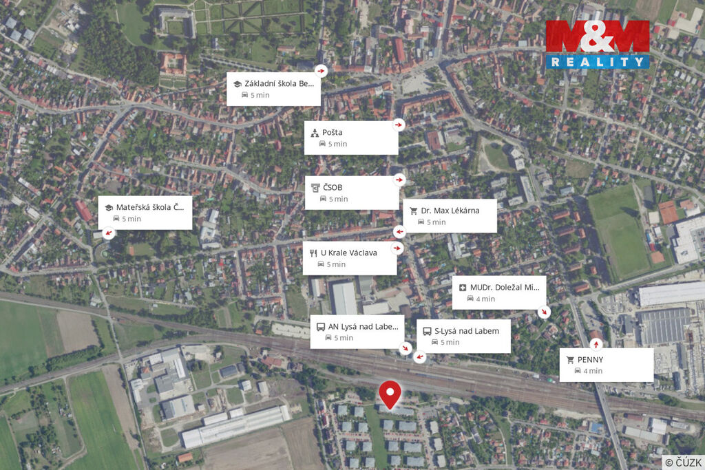 Dům se nachází ve slepé ulici, kde přímo proti vchodu je uzavřený areál s vlastním parkovacím stáním a ve vzdálenosti 120 m je velké dětské hřiště. V blízkosti domu se nachází vlakové nádraží, odkud jste za 35 minut v centu Prahy. Nájezd na dálnici D 11 je ve vzdálenosti 10 km.