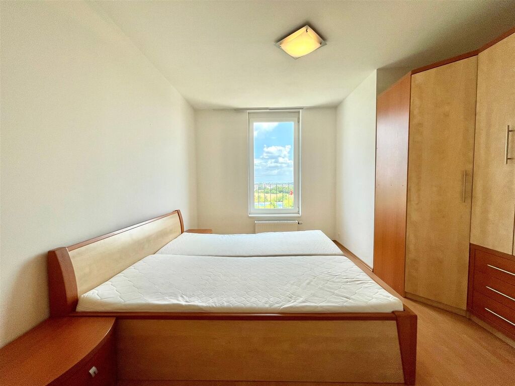 Byt disponuje obývacím pokojem s kuchyňským koutem (vybavený vestavěnými spotřebiči: horkovzdušná trouba, varná deska, digestoř, myčka, lednice s mrazákem), terasou přístupnou z obývacího pokoje, ložnicí, pokojem/pracovnou, koupelnou s vanou, samostatným WC, komorou/šatnou a předsíní. Byt je částečně vybaven: jídelní stůl + 4 židle, police, lampa, dvojlůžko s matracemi, 2 noční stolky, šatní skříň, 4 židle, úložné skříně, komoda a předsíňová stěna. Vytápění a ohřev vody je centrální, okna jsou plastová s izolačním dvojsklem a na podlahách je kombinace dlažby a plovoucí lamino podlahy. Z terasy a oken bytu je velmi pěkný panoramatický výhled.