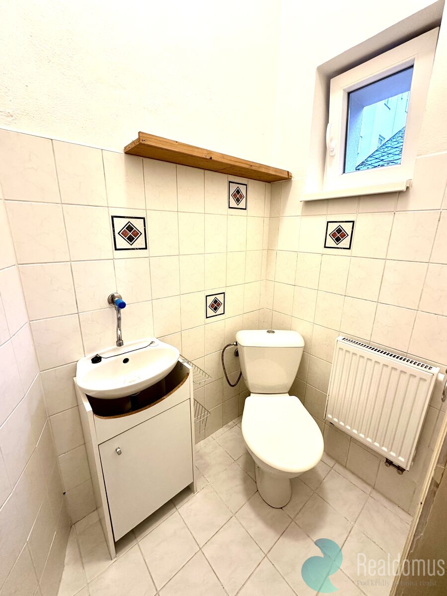 V chodbě se nachází koupelna, která je vybavena vanou, a toaleta, která je samostatně oddělena.
