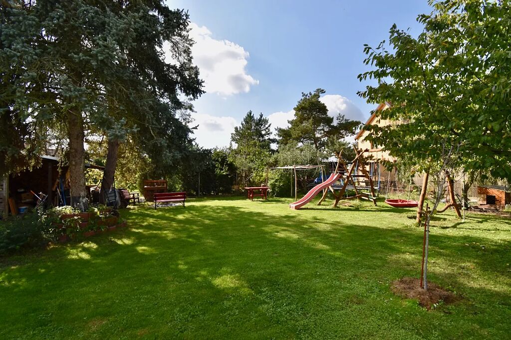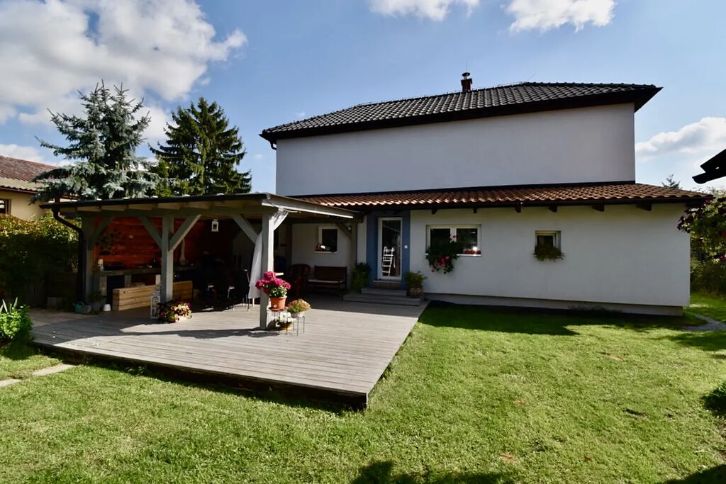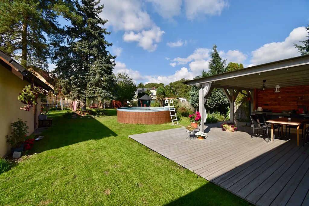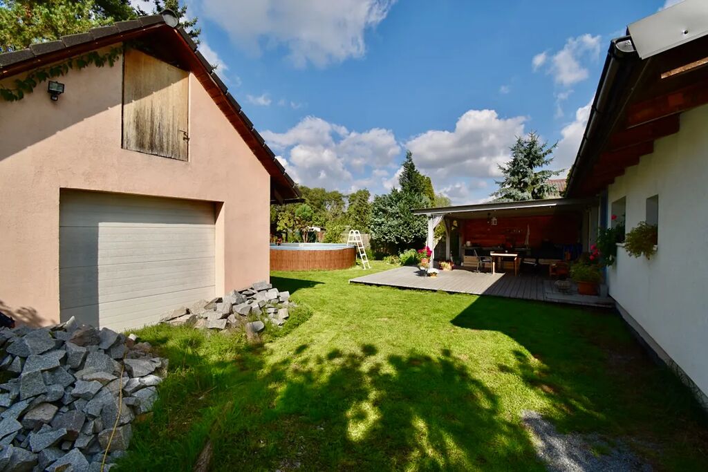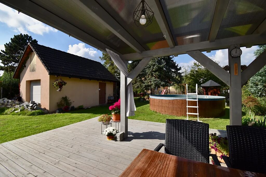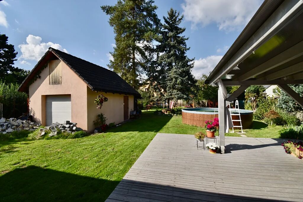 K domu náleží krásná zahrada se vzrostlými a okrasnými stromy v přední i zadní části. Majitelé při rekonstrukci domu dali plnou prioritu na rodinný komfort. Není nic lepšího než rovnou z kuchyně vyjít na vlastní zahradu i terasu a dohlížet na své děti ať už při hraní her nebo koupání v bazénu. Děti tak mohou být co nejvíce venku a vy můžete být v absolutním dosahu. Zastřešená terasa má i venkovní jednoduchou kuchyň, kde je klasický dřez a přivedená voda, můžete tak pohodlně připravovat jídlo i venku, grilovat apod.
