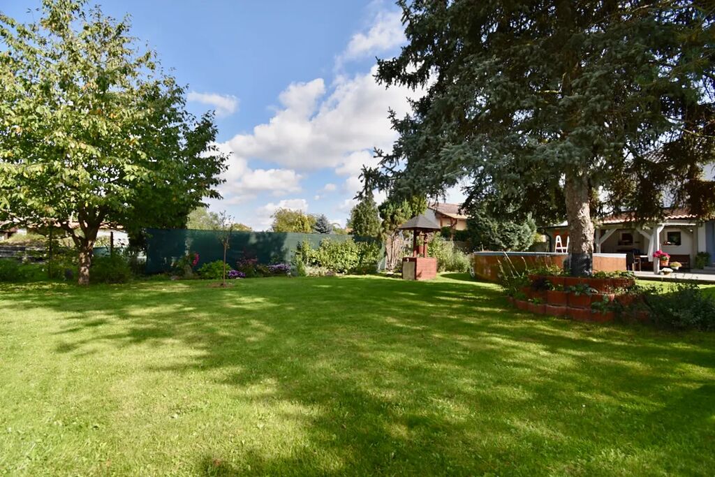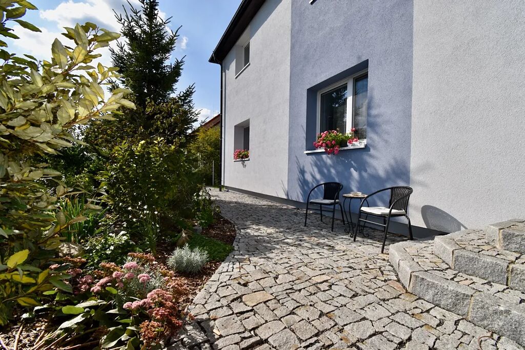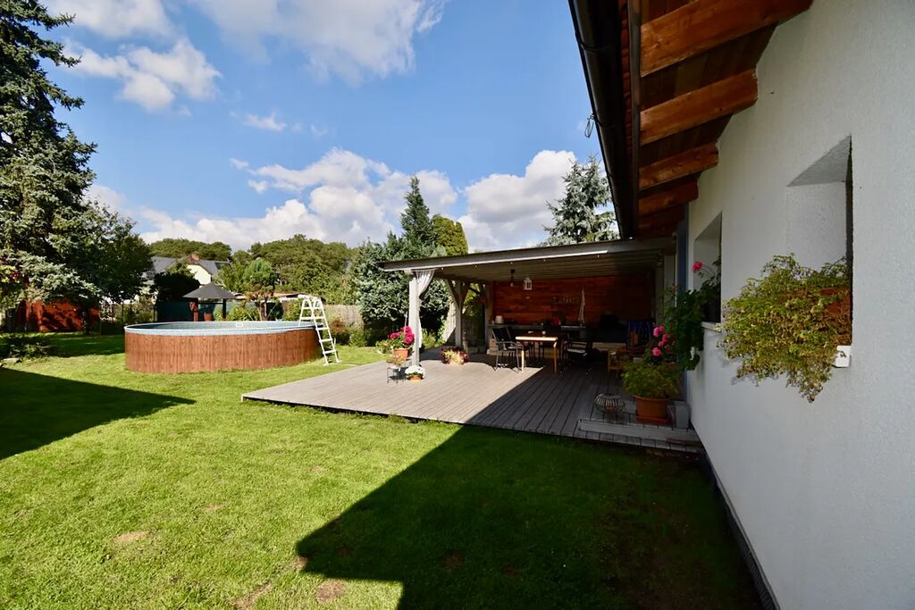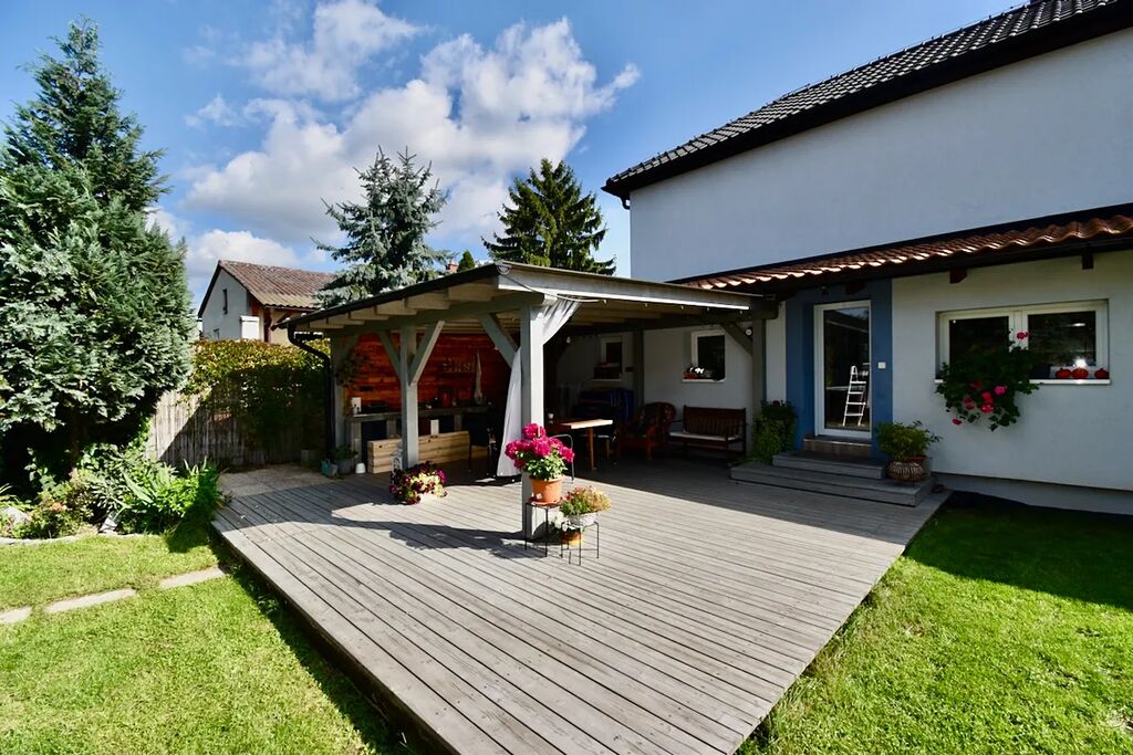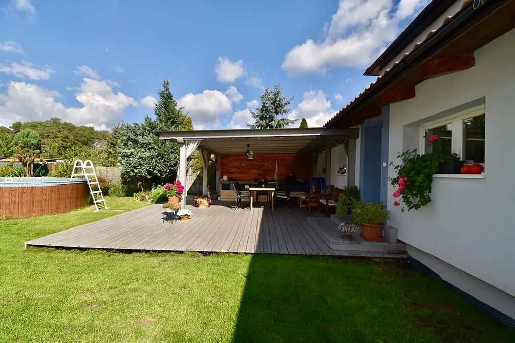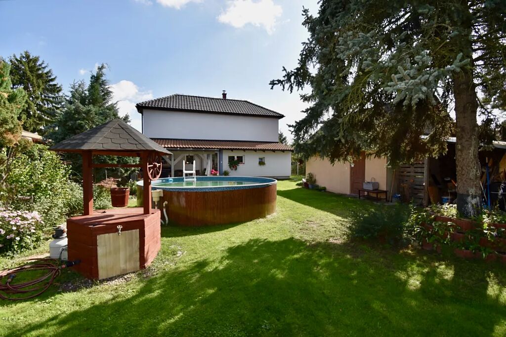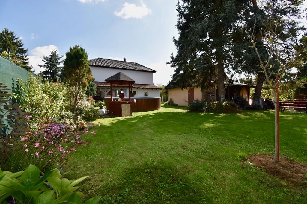 K domu náleží krásná zahrada se vzrostlými a okrasnými stromy v přední i zadní části. Majitelé při rekonstrukci domu dali plnou prioritu na rodinný komfort. Není nic lepšího než rovnou z kuchyně vyjít na vlastní zahradu i terasu a dohlížet na své děti ať už při hraní her nebo koupání v bazénu. Děti tak mohou být co nejvíce venku a vy můžete být v absolutním dosahu. Zastřešená terasa má i venkovní jednoduchou kuchyň, kde je klasický dřez a přivedená voda, můžete tak pohodlně připravovat jídlo i venku, grilovat apod.
