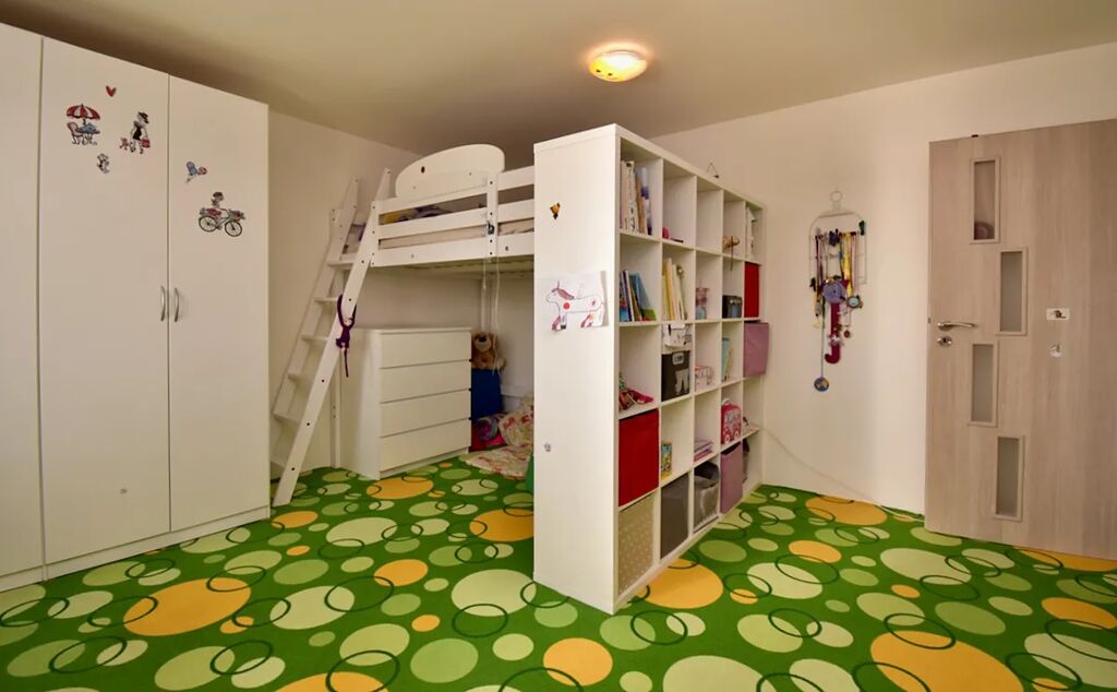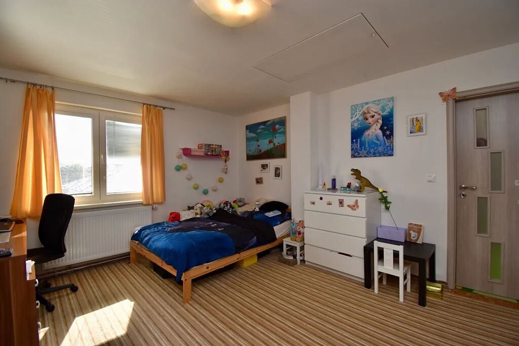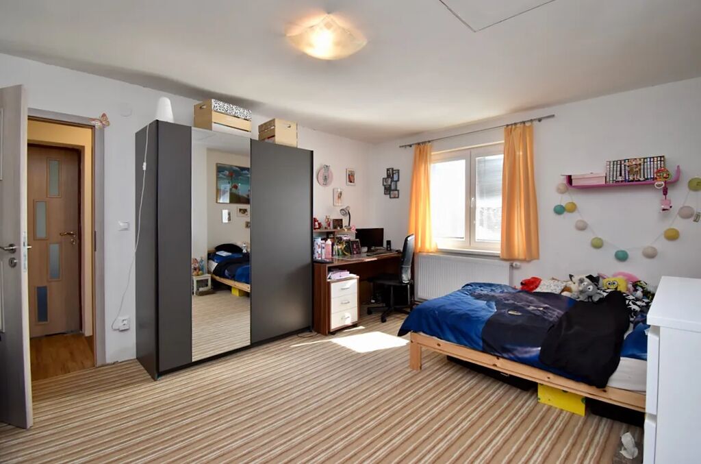V patře jsou umístěné dva dětské pokoje a třetí pokoj, který je připravený pro druhou koupelnu, ale lze zde mít i další dětský pokoj, pracovnu apod.