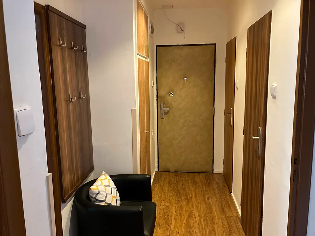 V bytě je vestavěná skříň a úložný prostor pod stropem v chodbě u kuchyně.