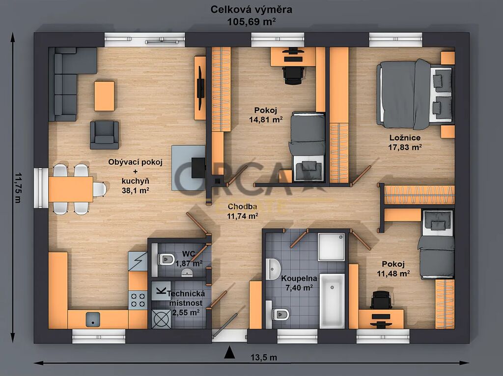 • prostorný obývací pokoj s kuchyňským koutem a vstupem na terasu – 38,1 m²