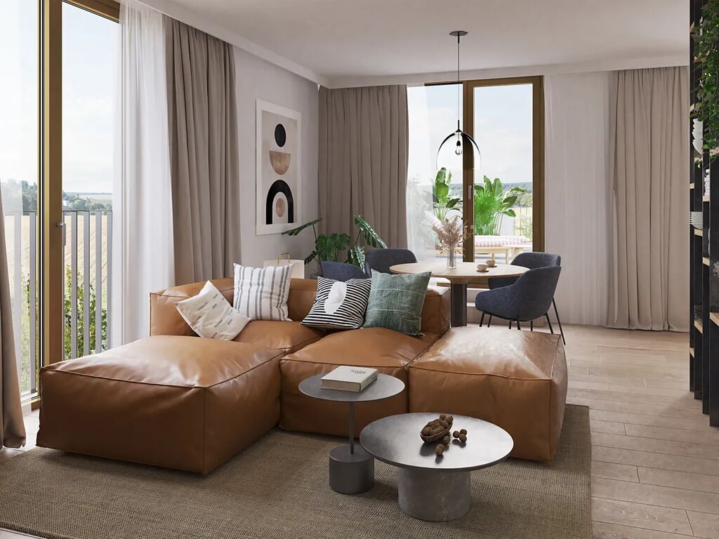 V bytě je prostorný obývací pokoj s obytnou kuchyní a přístupem na balkón o velikosti 14,3 m2. Dále jednotka nabízí prostornou ložnici, předsíň, pokoj s přístupem na druhou terasu, další pokoj, dvě koupelny a samostatné WC. K bytu je v ceně přiřazena 2x sklepní kóje, která se nachází v suterénu objektu.