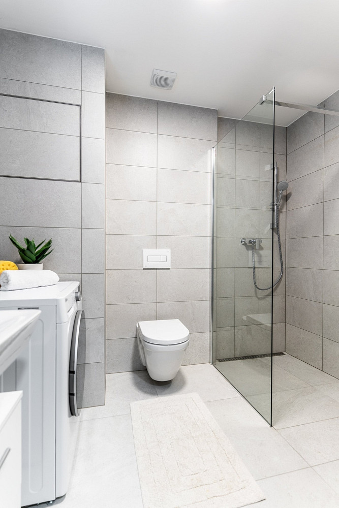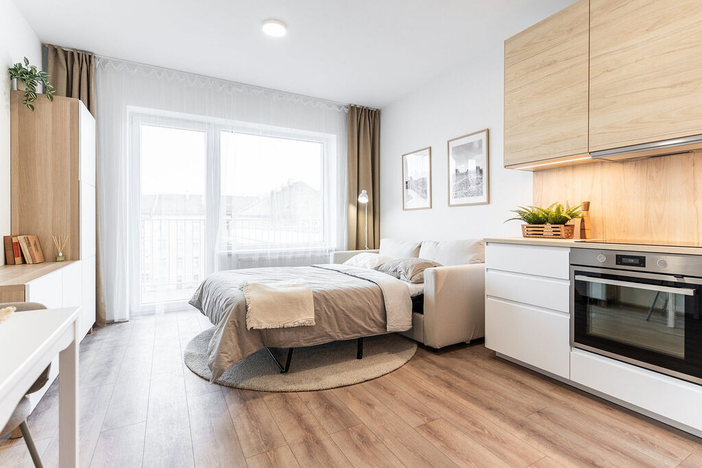 Abychom budoucím obyvatelům tohoto bytu ušetřili vynaložené úsilí při stěhování, vybavili jsme ho kuchyňskou linkou a pračkou se sušičkou. A nejedná se o nejlevnější kousky :) Nemalým bonusem je pak vybavení koupelny v podobě šuplat pod umyvadlem a zrcadlové skříňky, dále pak skříň v předsíni a zatemňovací závěsy.