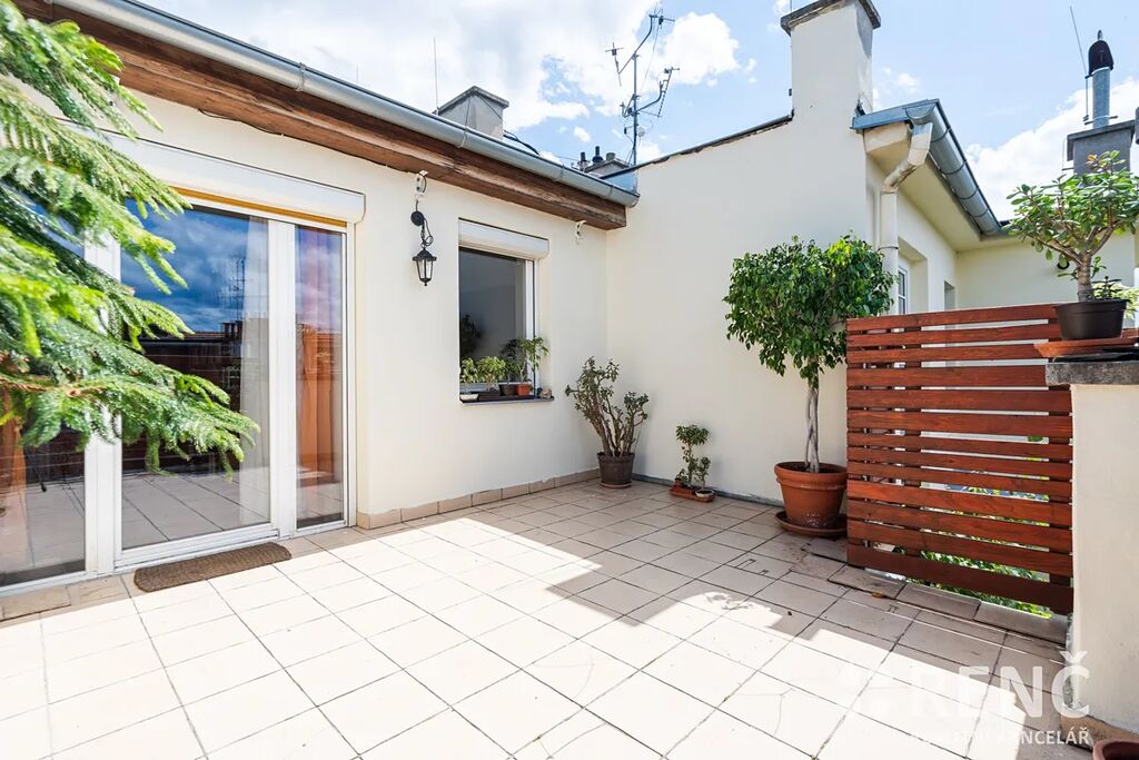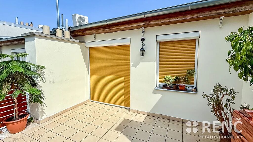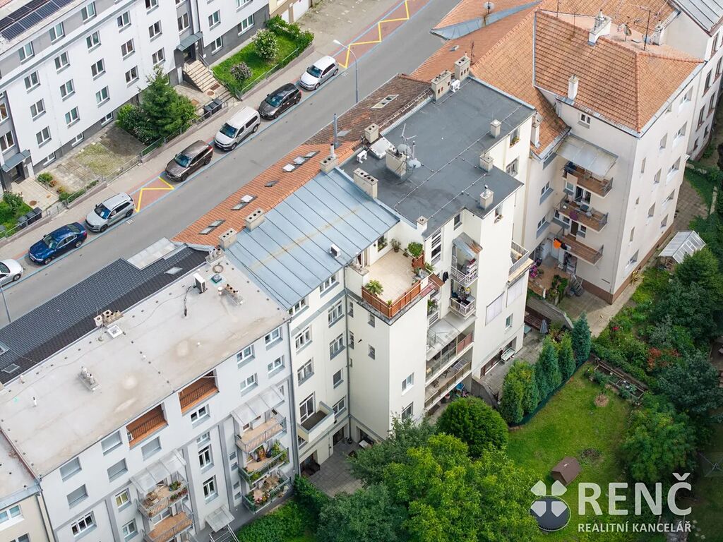 Ke koupi nabízíme prostorný světlý byt o dispozici 4+kk s terasou, který se nachází ve 4. patře zděného bytového domu na ul. Erbenova na úpatí čtvrti Černá Pole. K bytu lze koupit rovněž garáž v domě a s ní související parkovací stání pro druhý automobil před garáží. Součástí bytu je velká vstupní předsíň se šatní skříní, hlavní obytný prostor s kuchyní, jídelnou a vstupem na terasu, vše orientováno do vnitrobloku. Byt má rovněž tři samostatné ložnice a šatnu, koupelnu s velkým oknem a vanou a samostatné WC. Celková podlahová plocha bytu je 102 m2, terasa navazující na obývací pokoj má 19 m2. Plocha hlavního obytného prostoru je 42 m2, předsíň má výměru 4,2 m2, koupelna 6 m2, šatna 4 m2 a tři ložnice se střešními okny a zkosenými stropy mají výměry 18 m2, 13 m2 a 12 m2. Byt je orientován jihovýchodním a severozápadním směrem a je díky své poloze velmi dobře osvětlen. Za domem ve vnitrobloku je uzavřená společná zahrada, kterou lze využívat k odpočinku a posezení. V přízemí domu je místnost pro uložení kol a kočárků. Byt byl postaven a kolaudován v roce 2008 jako půdní vestavba ve střeše funkcionalistického bytového domu z roku 1934. Byt je vybaven kuchyňskou linkou včetně sklokeramické varné desky, elektrické trouby a myčky. V hlavním obytném prostoru je klimatizační jednotka. V předsíni je umístěna šatní skříň, v obývacím pokoji knihovna atp. Vytápění bytu a ohřev vody zajištuje vlastní plynový kotel umístěný v koupelně. Bytová jednotka má z části plastová okna včetně předokenních rolet, z části střešní okna Fakro včetně venkovních clon. Střecha nad bytem s keramickou a plechovou krytinou je z roku 2008, krov dřevěný. Vnitřní stěny bytu jsou z části zděné a z části sádrokartonové. Podlaha v obývacím pokoji dřevěná, v ložnicích lamino a podlahy keramické v koupelně, na WC a v předsíni. Terasa bytu má keramickou dlažbu, nyní v září 2025 proběhne generální oprava terasy včetně nové hydroizolace, nášlapná vrstva bude nahrazena odolným cedrovým dřevem. Měsíční zálohové platby za služby spojené s užíváním bytu (voda, fond oprav, společné výdaje domu) činí 2.987 Kč. Nad rámec této platby je hrazena spotřeba plynu pro ohřev vody a vytápění bytu ve výši 2.000 Kč a spotřeba elektřiny ve výši 1.300 Kč, celkem tedy činí měsíční náklady za užívání bytu 6.300 Kč. K bytu je možné koupit i garáž za cenu 2.000.000 Kč, která je umístěná v domě, díky pozemku před garáží ve spoluvlastnictví majitelů je tak možné zaparkovat dva automobily. V okolí domu jsou rovněž veřejná parkovací místa – modré zóny kategorie C, pro rezidenty za roční poplatek 800 Kč. Prvorepublikový bytový dům prošel opravami společných částí, včetně honosného vstupu obloženého z části mramorem, má nové vstupní dveře, novou fasádu, nové vedení páteřních instalací, zahrada je udržovaná, v domě funguje velmi dobře SVJ. Dům je situován na úpatí Černých Polí, cca 100 m od parku Lužánky, v okolí je veškerá občanská vybavenost, do centra města je možné dojít během 10-ti minut přes park pěšky. V případě zájmu o prohlídku nás prosím kontaktujte. Nemovitost bude k nastěhování na podzim 2025 v termínu dle dohody. Byt je možné použít jako zástavu v případě financování koupě prostřednictvím úvěru.