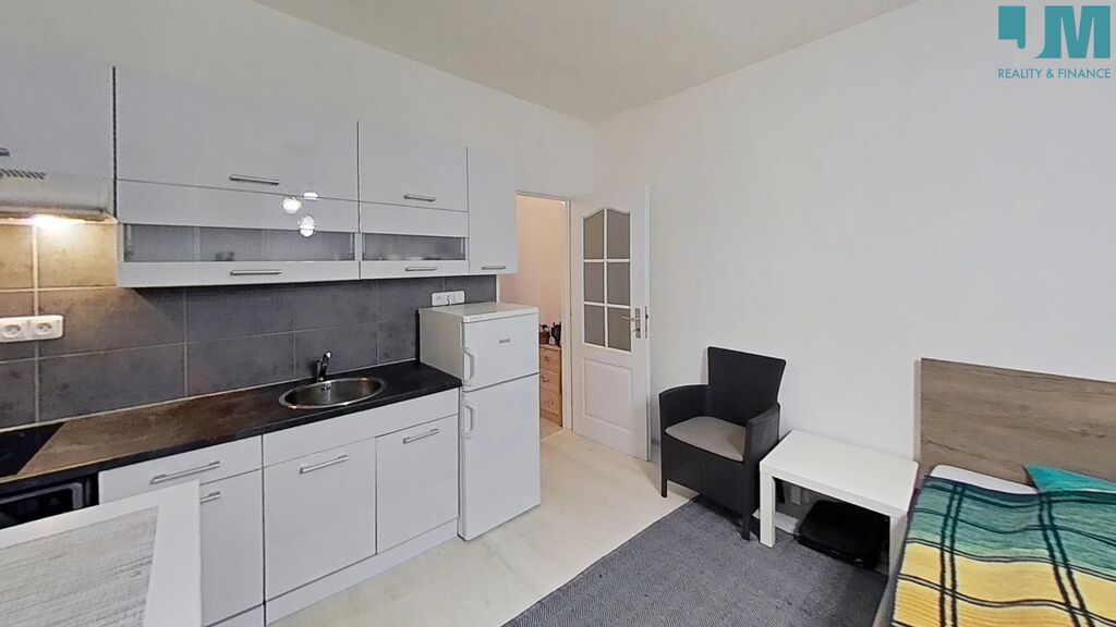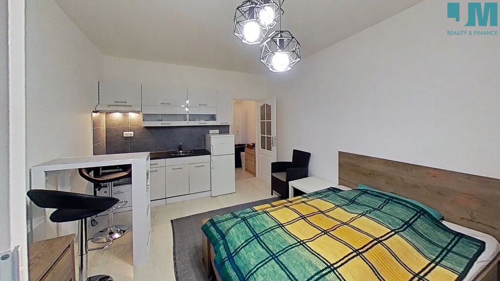 Vybavení tohoto bytu zahrnuje kuchyňskou linku se sklokeramickou deskou, elektrickou troubou, digestoří, mikro myčkou, lednicí, mikrovlnnou troubou a lednicí s mrazákem Dále zde najdete barový stůl s židlemi, křeslo, postel, komoda a televize a pro Váš relax. Pro uložení Vašich věcí je na chodbě k dispozici zrcadlová šatní skříň, úložné prostory, botníková stěna s policemi a křeslo.