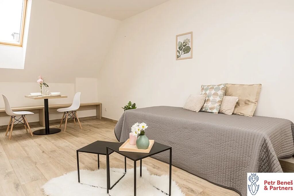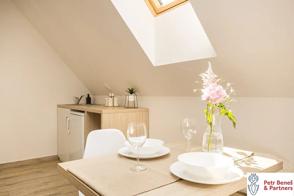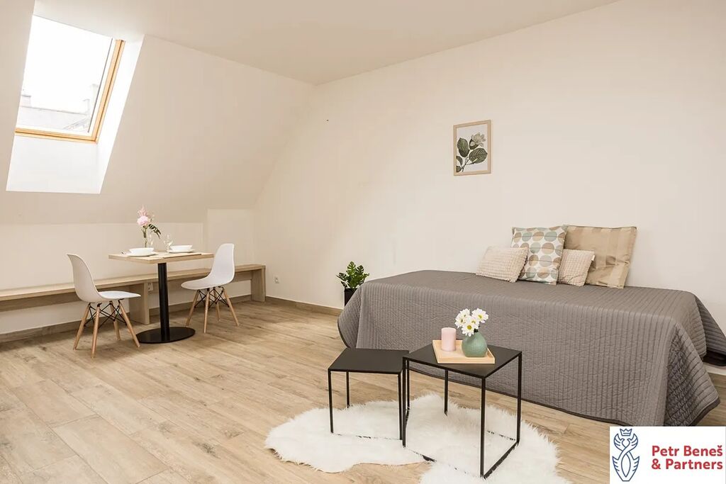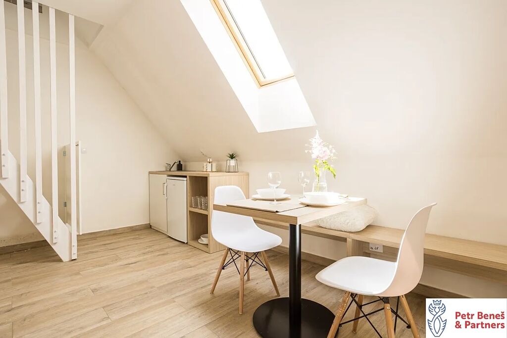 Byt o dispozici 1+1 je řešen jako útulný mezonet: