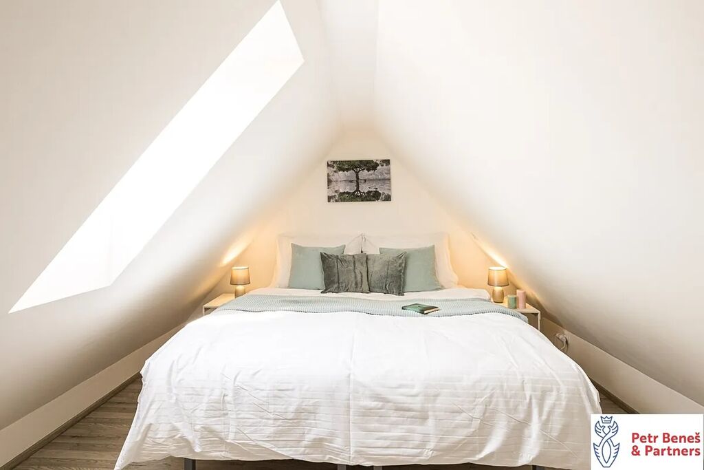 • po schodech pak vystoupáte do podkrovní ložnice, která nabízí klidný prostor na spaní a odděluje zónu odpočinku od denního života,