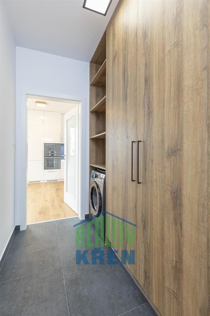 • Hala (10 m²): Nabízí chytře řešený úložný prostor – prostornou vestavěnou skříň, která skrývá pračku a sušičku.