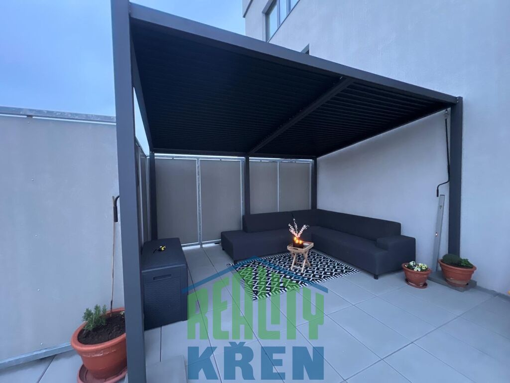 K bytu náleží velkorysá terasa (62 m²), která je vybavena pergolou a venkovním nábytkem.