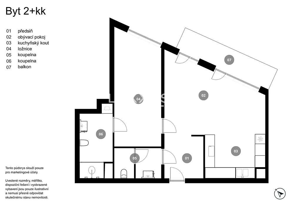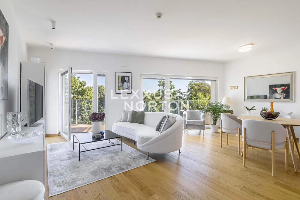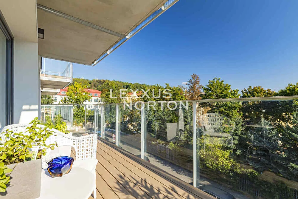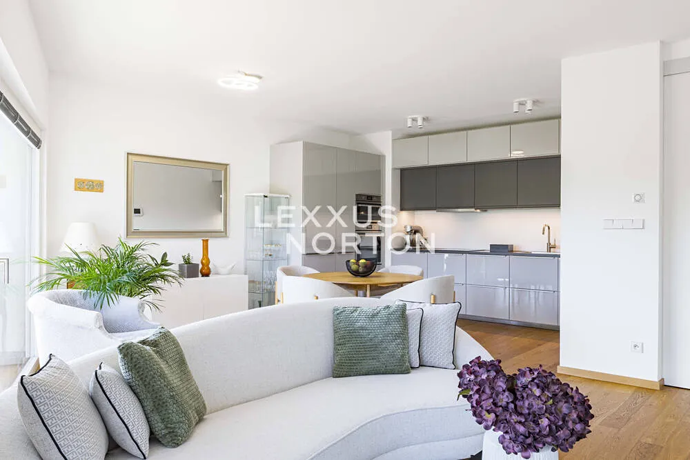 Byt disponuje balkonem o rozloze 12,6 m² s panoramatickým výhledem do přilehlého parku, sklepní kójí a garážovým stáním. Interiér je navržen s důrazem na vysoký standard: prostorná předsíň, koupelna pro hosty, vzdušný obývací pokoj s moderním a nadčasovým kuchyňským koutem a přímým vstupem na balkon, ložnice a druhá koupelna se sprchovým koutem. K vybavení patří podlahové vytápění a koupelny osazené designovou sanitou značky Villeroy & Boch, které podtrhují nadčasovou eleganci interiéru.