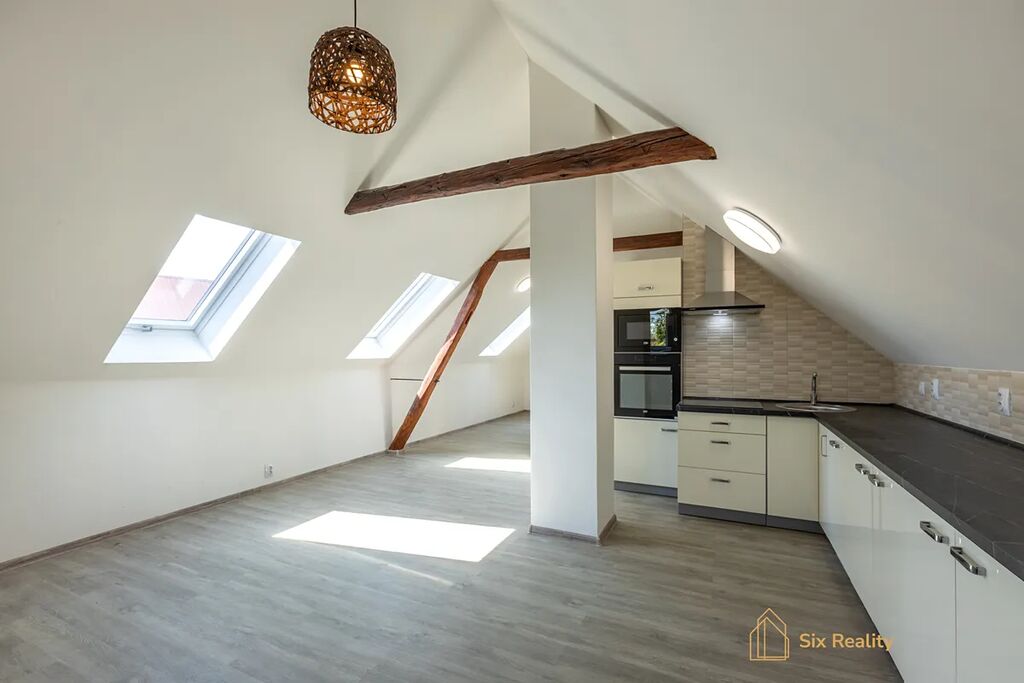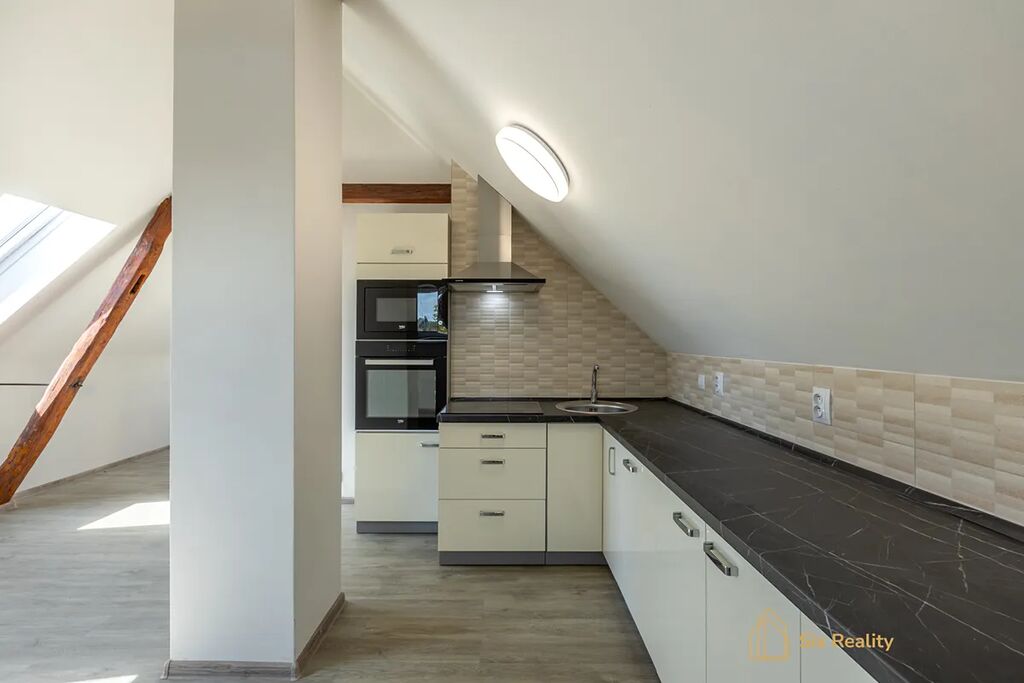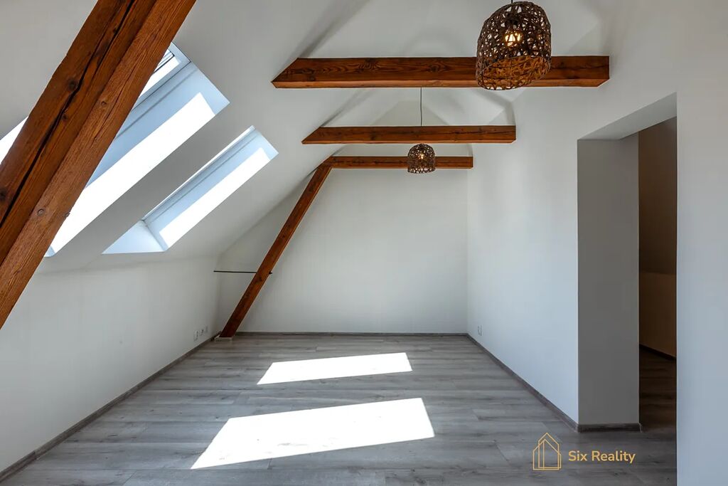 V podkroví se rovnou zabydlíte bez dalších investic, protože byt je po kompletní rekonstrukci o dispozici taktéž 3+kk a velikosti 85 m².