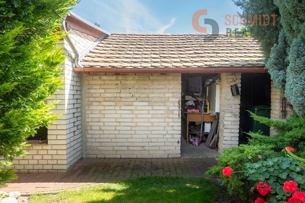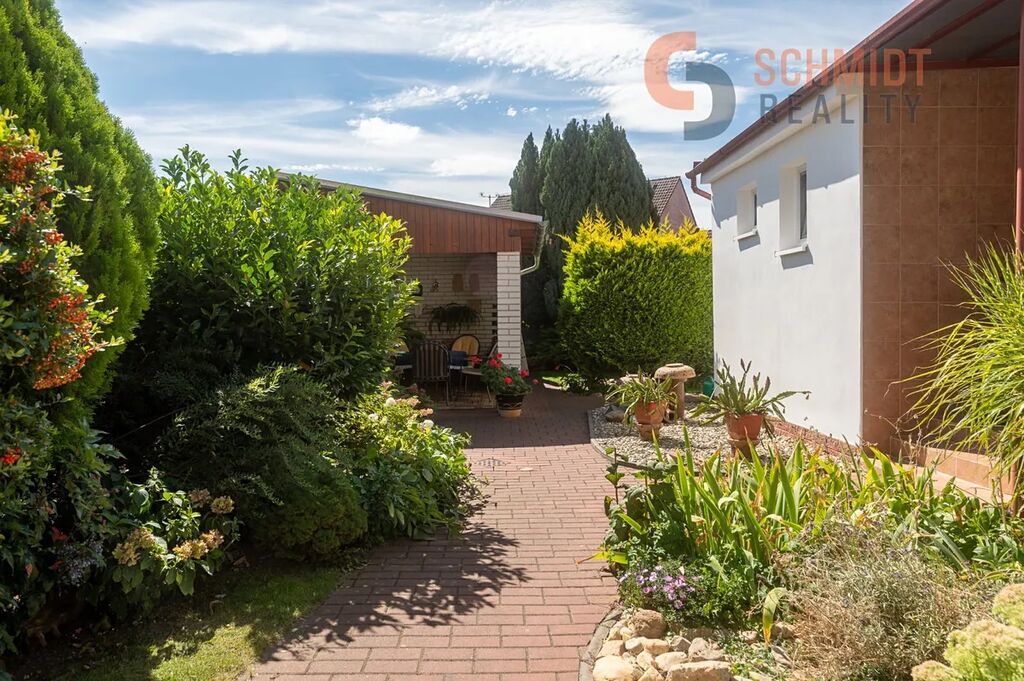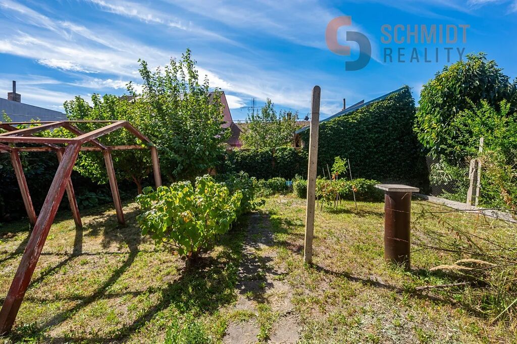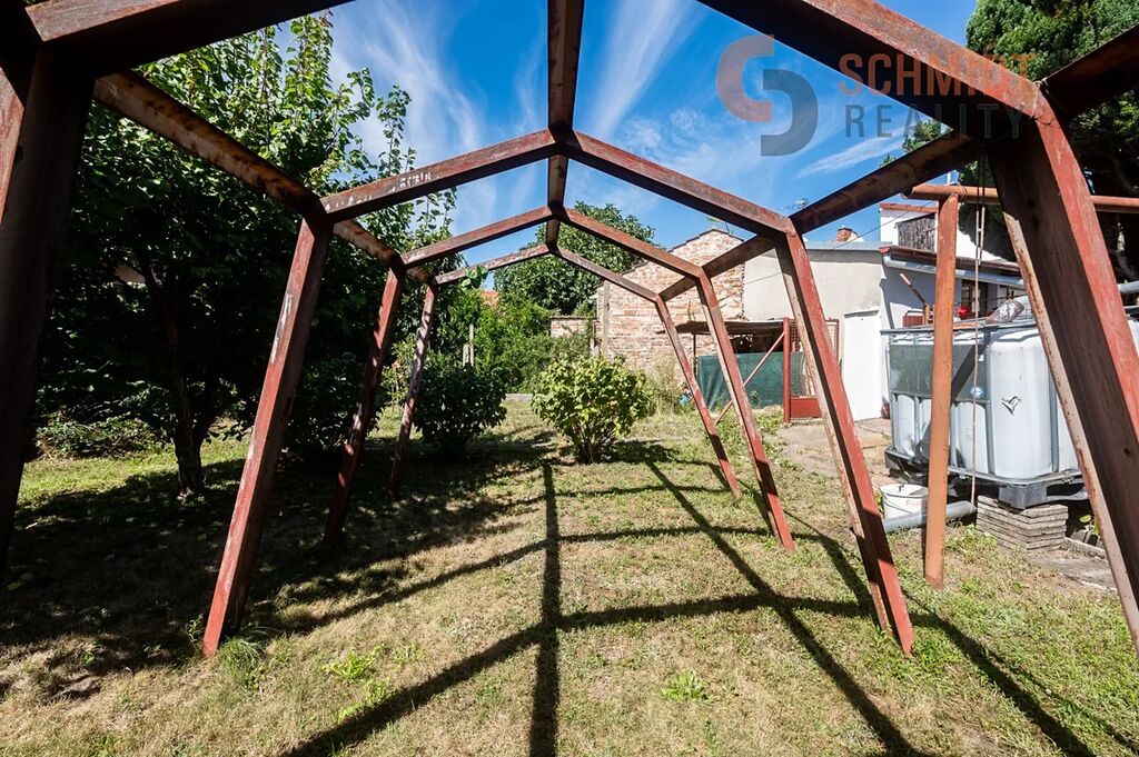 Pozemek za domem je rozdělený na část odpočinkovou s přístřeškem pro posezení, a na část užitkovou, která je využívána pro pěstování zeleniny, ale i uskladnění nářadí.