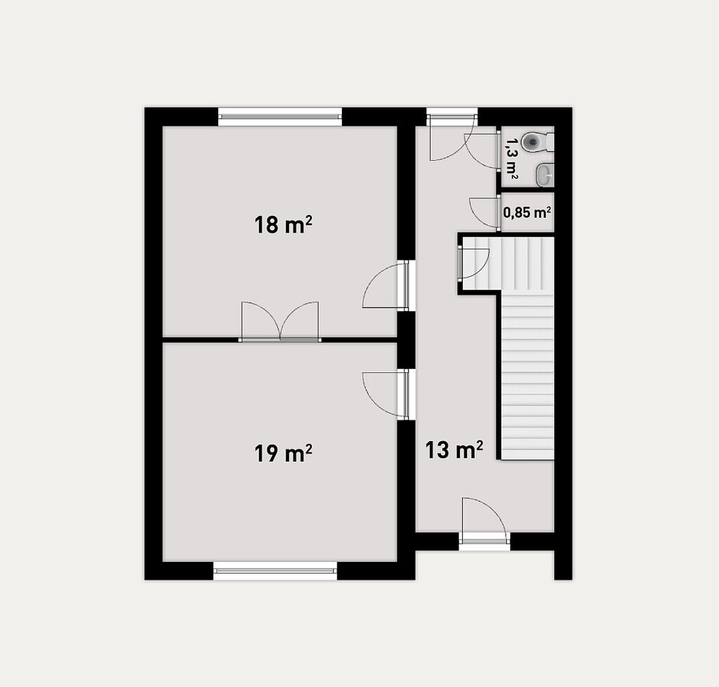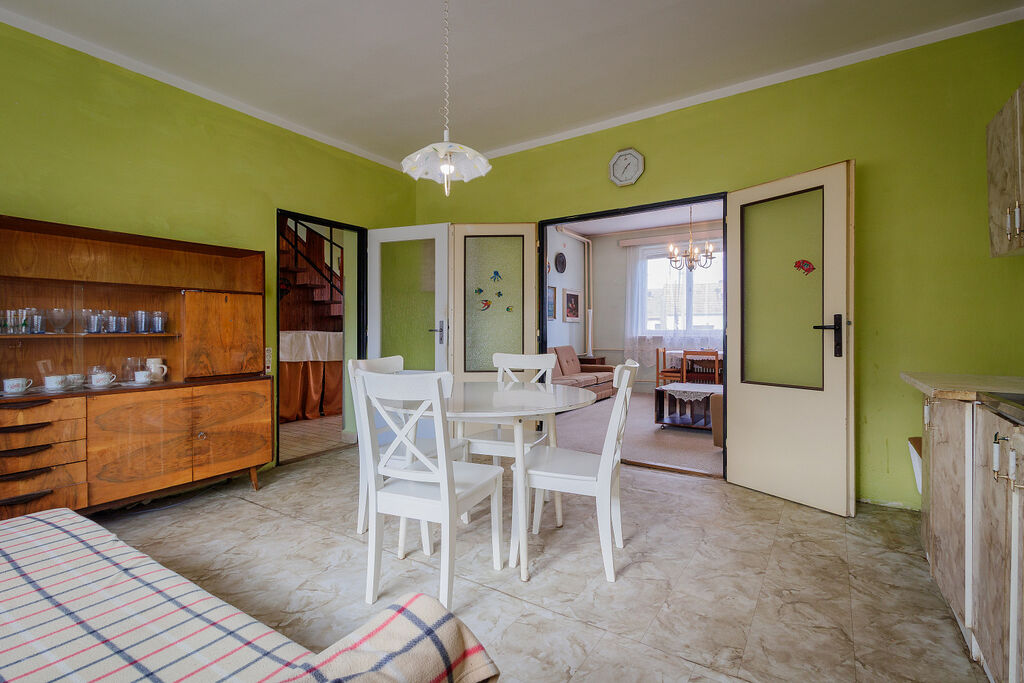 - V přízemí: kuchyně, prostorný obývací pokoj s možností propojení obou pokojů, samostatné WC, spíž, chodba se vstupem do sklepa a na zadní část pozemku.