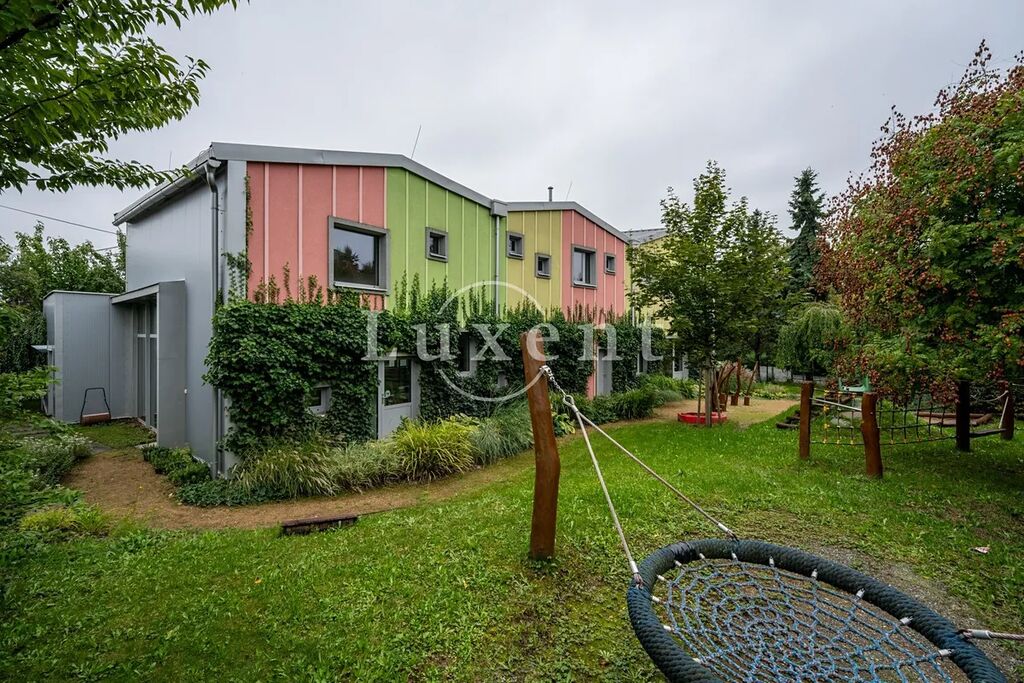 První nadzemní podlaží je přístupné samostatným vstupem ze zahrady, což umožňuje oddělené fungování jednotlivých částí objektu. Tato část obsahuje další dvě učebny s příslušenstvím a také samostatnou bytovou jednotku 2+kk o výměře 49 m². Ta může sloužit jako služební byt, kanceláře nebo zázemí pro další aktivity. Budova je situována uprostřed oploceného pozemku a ze všech stran ji obklopuje pečlivě upravená zahrada. Ta byla navržena s důrazem na bezpečnost i herní potřeby venkovních aktivit. Vzrostlá zeleň a uspořádání zahrady vytvářejí příjemné mikroklima a přirozený prostor pro dětské hry i odpočinek. K nemovitosti náleží tři parkovací místa.