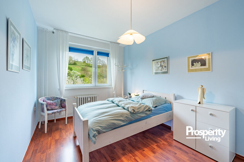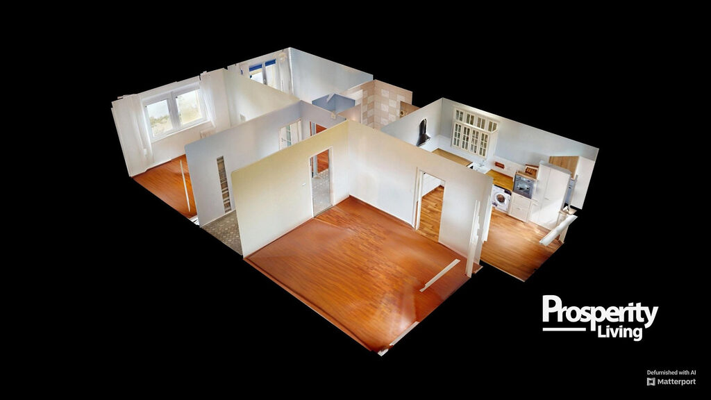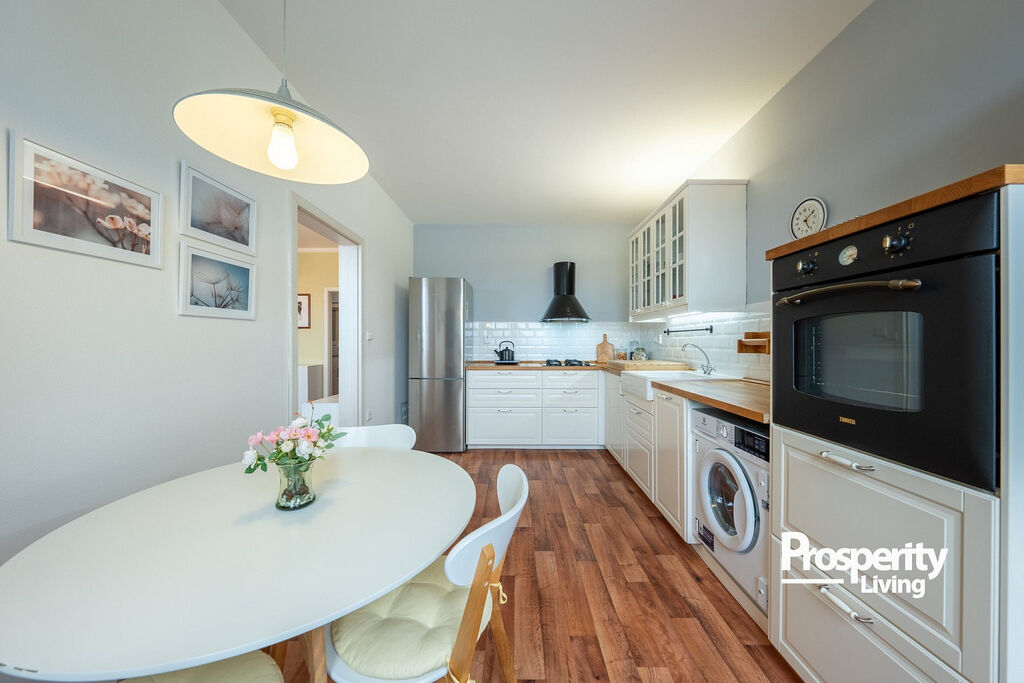 Celková dispozice bytu nabízí prostorný obývací pokoj, samostatnou kuchyni s jídelním koutem, dvě ložnice, předsíň s dostatkem úložných prostor, koupelnu a WC. Kuchyň je vybavena moderní linkou s vestavěnými spotřebiči včetně trouby, digestoře a pračky. Interiér působí svěže a útulně díky kvalitním podlahám, novým dveřím, neutrálním barvám a dostatku denního světla. Byt je částečně zařízený a připravený k okamžitému nastěhování.