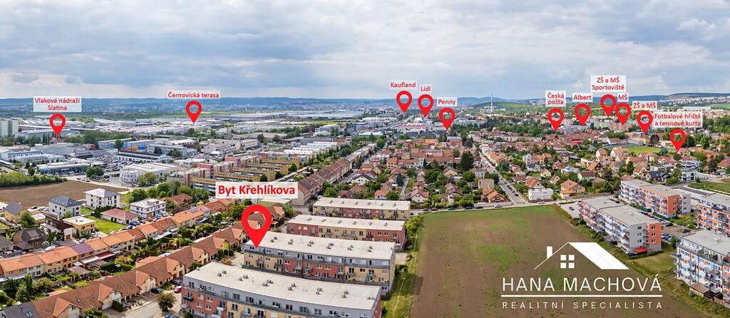V blízkosti se nachází autobusová i trolejbusová zastávka směr letiště (5 minut), centrum (15 minut), nákupní centrum Olympia Chrlice a další. Výborná dostupnost dálnice D1 (1 km od domu), i vlakového nádraží Slatina. Městská část Slatina má veškerou občanskou vybavenost, MŠ/ZŠ, v blízkosti se nachází obchodní centrum Slatina, jehož součástí je i prodejna Kaufland a zábavní centrum pro děti BRuNO family park, dále Lidl, Penny, Albert, blízko domu sportovní hala Xarena Slatina, dále fotbalové hřiště i několik dětských hřišť. Městská část Slatina navíc žije bohatým kulturním životem.