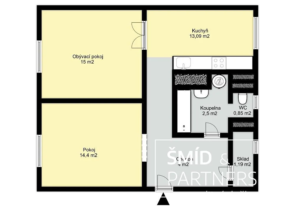 Kuchyně je vybavena kuchyňskou linkou s vestavěnou elektrickou troubou, sklokeramickou deskou a digestoří, obývací pokoj je s kuchyní propojen pomocí dvoukřídlých dveří, samostatná a neprůchozí ložnice je přístupná z chodby. Koupelna byla obložena keramickým obkladem, je vybavena vanou, umyvadlovou skříňkou se zrcadlem, je zde umístěna příprava na pračku a bojler zajišťující ohřev teplé vody, WC. V bytě je zachována komora tolik potřebná na uložení neskladných věcí.