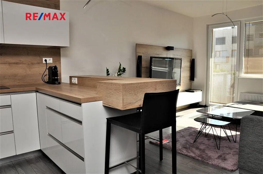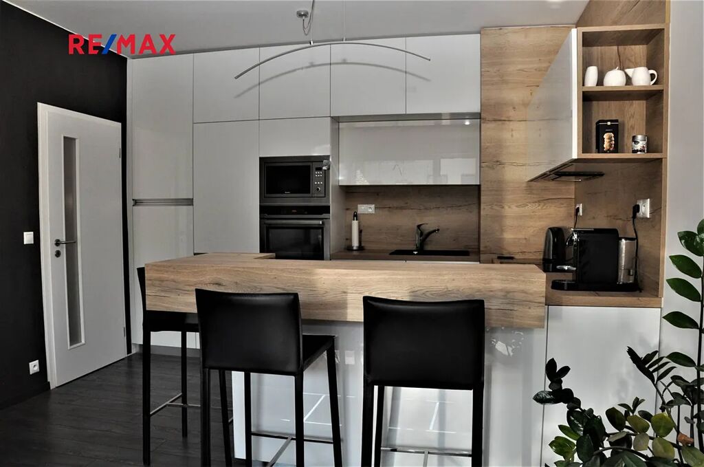 Byt má praktickou dispozici, je zařízen nábytkem na míru, kuchyně má veškeré spotřebiče včetně integrované pračky se sušičkou.