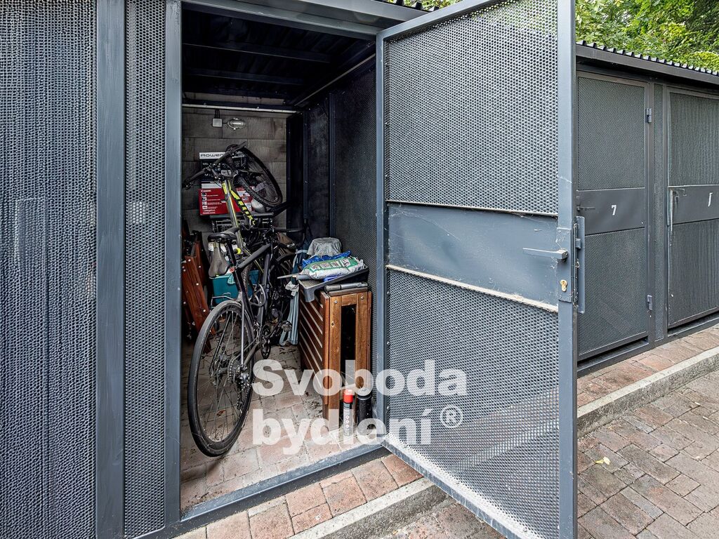 Vstupní dveře bytu vedou do prostorné předsíně se vstupy do jednotlivých místností. Po pravé straně od vchodu nalezneme ložnici (cca 14m2) s balkonem (cca 3m2). Proti vstupu do bytu se nachází druhá ložnice (cca 15m2), koupelna (cca 4m2) a samostatná toaleta. Nalevo od vstupu je komora a obývací pokoj s kuchyňským koutem ( cca 21m2). Na pozemku za domem se nachází praktický úložný prostor v podobě zahradní koje.