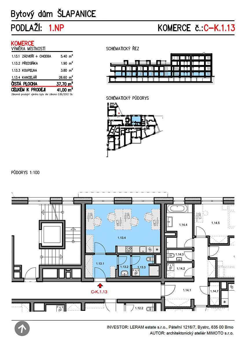 V rámci tohoto projektu nabízíme k prodeji ateliér o velikosti 41 m² který se nachází v 1. – 4. nadzemním podlaží budovy C. Dispozice ateliéru zahrnuje zádveří s chodbou, předsíňku, koupelnu s WC a kancelář.